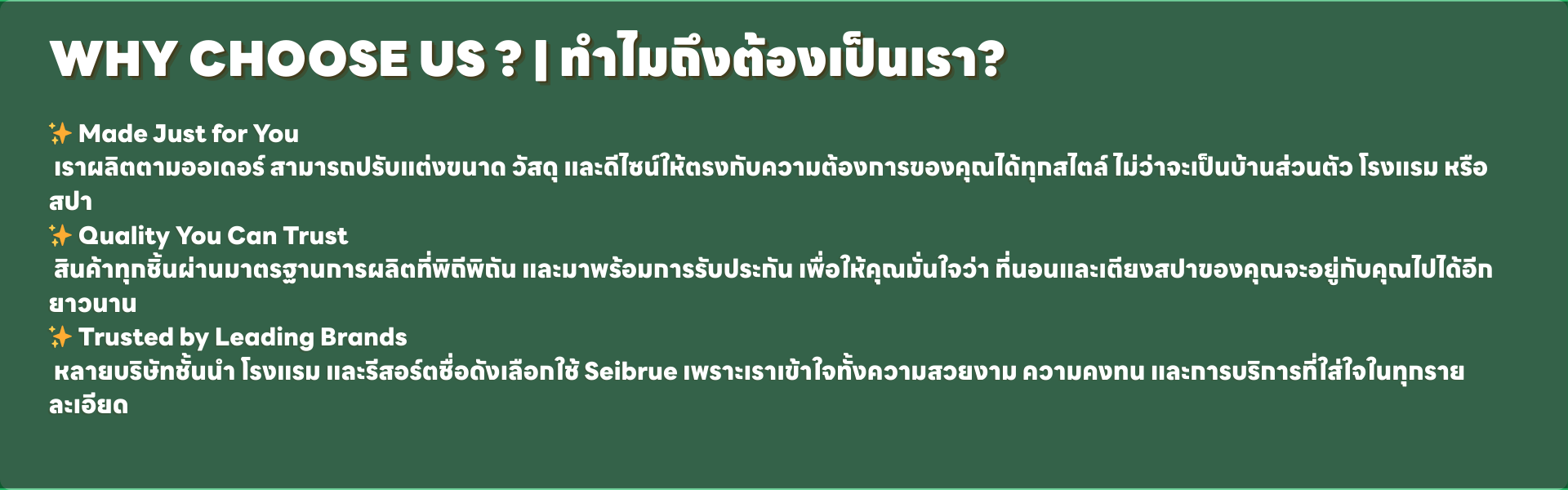 Seibrue คือแบรนด์ที่นอน เครื่องนอน และเตียงสปาคุณภาพสูง ซึ่งมีประสบการณ์ในอุตสาหกรรมการผลิตมากกว่า 20 ปี